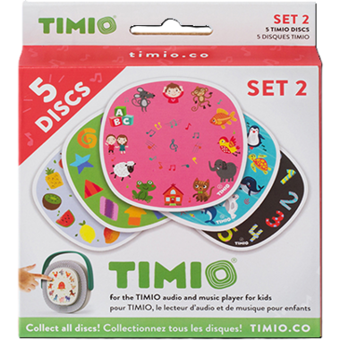 Extension set for the Timio player, featuring themes of sea creatures, nursery rhymes (volume 2), shapes, fruits, and numbers.