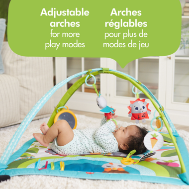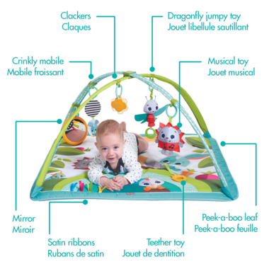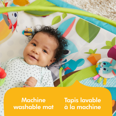 The Sunny Day Gymini is an innovative developmental mat filled with fun and challenging activities, friendly characters and vibrant colors that take baby on a journey of exploration. Every part of the Gymini was carefully designed with baby’s development in mind, inspiring them to continuously discover, learn, and grow. When baby enters the Gymini, they are greeted with delightful toys and characters they will love,including a baby-activated musical toy. The Gymini’s expandable arches adjust to give baby even more play modes. When the arches are closed, baby can lie down and delight in the activities above; as baby grows,the Gymini becomes a playground for tummy time fun. When the arches are fully opened,baby can sit upright and continue their learning journey. There is even enough room for parents to enter, and build the family bond. The Sunny Day Gymini was created to encourage development in every area of the 7 developmental wonders