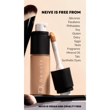 Directions: Shake well. Uncap the bottle and dispense 1-2 pumps on your hand. Blend into your skin with your fingers or the TOK Blending Brush. Build coverage by applying another thin layer wherever needed. You can also apply Neive using the doe foot applicator as a concealer or spot corrector. Twist off the cap and use the applicator to apply to any areas you would like to even out skin tone. Blend with your fingertips or the TOK Concealer Brush.