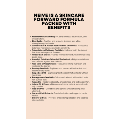 Aqua (Water), Heptyl Undecylenate, Glycerin, Caprylic/Capric Triglyceride, Polyglyceryl-6 Polyricinoleate, Polyglyceryl-3 Diisostearate, Polyglyceryl-6 Polyhydroxystearate, Propanediol, Jojoba Esters, Silica, Capryloyl Glycerin/Sebacic Acid Copolymer, Coco-Caprylate/Caprate, Leuconostoc/Radish Root Ferment Filtrate, Niacinamide, Gluconic Acid, Lactobacillus, Sodium Benzoate, Zinc Oxide, Disteardimonium Hectorite, Stearalkonium Hectorite, Lysolecithin, Xanthan Gum, Sclerotium Gum, Propylene Carbonate, Hydrolyzed Rice Protein, Rosa Rubiginosa Seed Oil, Simmondsia Chinensis (Jojoba) Seed Oil, Vitis Vinifera (Grape) Seed Oil, Oryza Sativa (Rice) Bran Oil, Punica Granatum (Pomegranate) Seed Oil, Argania Spinosa Kernel Oil, Pullulan, Phospholipids, Ascorbyl Palmitate, Cellulose Gum, Polyhydroxystearic Acid, Aloe Barbadensis Leaf Juice, Tripeptide-29, Salix Alba (Willow) Bark Extract, Cocos Nucifera (Coconut) Fruit Extract, Sodium Chloride, Magnesium Sulfate. May Contain (+/-): Mica, Titanium Dioxide (CI 77891), Iron Oxides (CI 77491, CI 77492, CI 77499), Ultramarines (CI 77007)