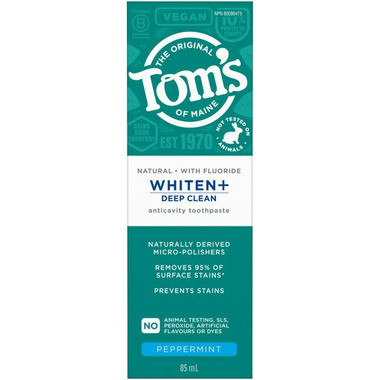 Natural Oral Care: Tom’s of Maine Whiten Plus Deep Clean is not tested on animals and is made with no peroxide, artificial flavors, SLS, or dyes.
