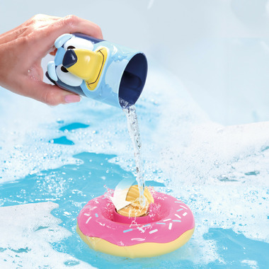 Bluey bobs around on her colorful pool float but kids can lift Bluey off the float to reveal a water wheel ready for spinning action! This smart water toy comes in two parts: a floating ring with water wheel and a Bluey pouring cup, and both are the perfect size for little hands to hold! The easy-to-grip Bluey cup has holes for sprinkling water.