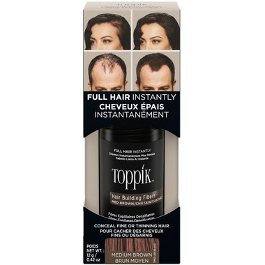 - One 0.42 oz bottle of Toppik Hair Building Fibers, Medium Brown Hair Fibers for Thinning or Thin Hair