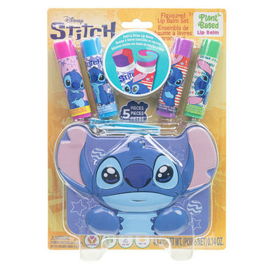 Keep your lips soft and stylish with this Stitch 4-pack swirl lip balm set! Each balm features a fun swirl design and delightful flavors, all packed in a collectible Stitch-shaped character tin. Perfect for Disney fans and on-the-go lip care!