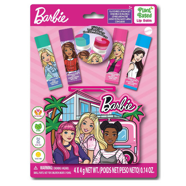 Stay stylish with this Barbie 4-pack swirl lip balm set! Each balm features a fun swirl design and delightful flavors, all packed in a collectible Barbie-shaped character tin. Perfect for Barbie fans and keeping your lips soft on the go!