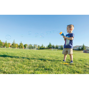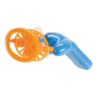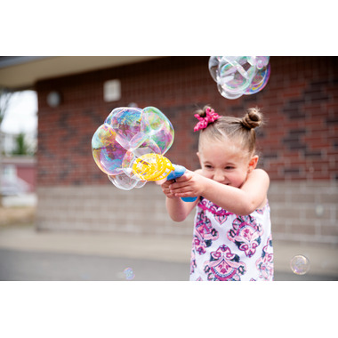 Pull the trigger to make bubbles INSIDE another bubble. Includes 7" bubble blower, 4 oz. bubble fluid and dipper dish. Requires 1 AA battery (not included).