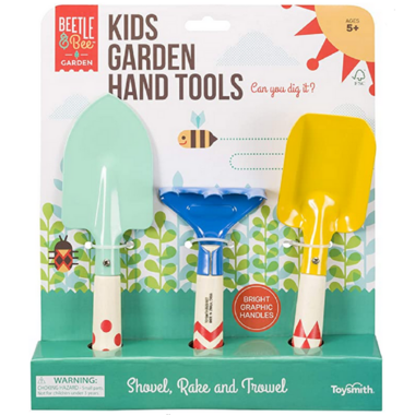 An evergreen kids gardening staple from the Beetle and Bee collection. Three sturdy hand tools measure up to 8" long. Made from FSC certified materials.