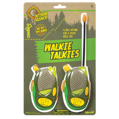 Take these Walkie Talkies with you this summer to explore the great outdoors. Uses 9V batteries (not included). Morse Code is printed on the bottom of each - use it to communicate with friends up to 250 feet away! Other features are a flexible antenna and volume control.