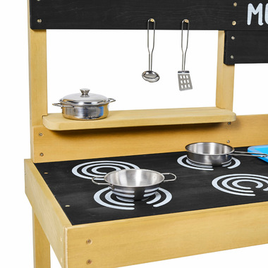 This all wood mud kitchen features a painted hob area,a removable plastic sink tub, a pan rack, a serving station and a handy storage shelf to store the stainless steel pots and pans set included with the kitchen.
