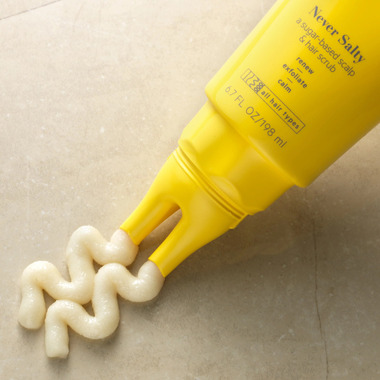 Never Salty is an ooey-gooey sugar scrub that helps to unclog and cleanse the scalp for a clean, refreshed, and happy feel. The duo-touch tube provides low-mess application, while this gentle exfoliator transforms into a balm as you work it in and easily rinses out.