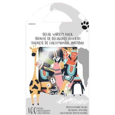 This product includes 100 individual various size 4 colour decals. The packaging is a 4 colour, sturdy stock, with handle for easy carrying.