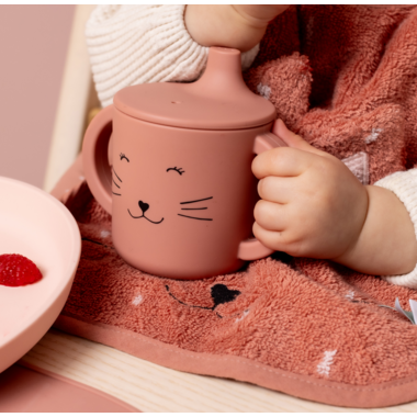 The big handles make this easy to use and they offer great practice for holding and tilting as your child would with an open cup. This sippy cup allows your child to drink without spilling; especially handy when you're out and about. Silicone is great for use in the kitchen. Even with intensive use, it will stays in good shape and can easily be passed down to little brothers, sisters or friends.