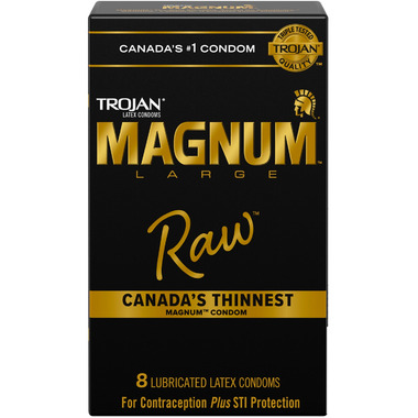 Magnum Raw is Canada's thinnest Magnum large size condom which is carefully designed to bring you next-level sensation and comfort. They're larger than standard latex condoms, and thinner than any other condom in the Magnum line. Talk about the best of both worlds! Trojan Magnum Condoms are larger than standard size latex condoms for extra comfort. They're perfect for men who find standard condoms restrictive and uncomfortable. Their comfort-enhancing design is tapered at the base for a secure fit and features a special reservoir tip for added safety. Magnum condoms have a silky smooth lubricant for extra comfort and sensitivity. Made from premium quality latex to help reduce the risk of pregnancy and STIs. Each condom is electronically tested to help ensure reliability.
