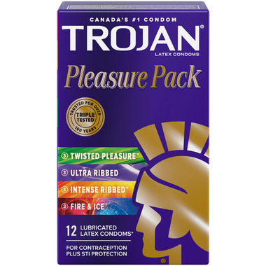 TROJAN Pleasure Pack Assorted Lubricated Latex Condoms features an assortment of condoms with unique designs and lubricants for the ultimate pleasure experience. Varieties include Twisted Pleasure, Her Pleasure Ultra Ribbed, Intense Ribbed and Fire & Ice condoms. Each condom is made from a premium quality latex with a low odour for an enhanced intimate experience.