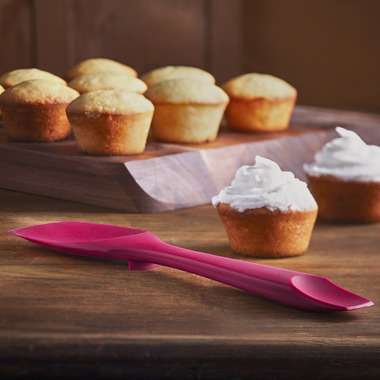 Prepare the perfect cake with this 2-in-1 Spoon Spatula! Specially designed to scoop up batter, it is non-stick and will not scratch bowls or cookware. It's made of a single piece of high-quality silicone for maximum hygiene and is stain and odour resistant. The smaller end of the spatula can be used for smaller tasks, like adding frosting on a cake. Its integrated tool rest will help in keeping your counter clean. Pop it in the dishwasher when you're done.