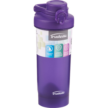 The Trudeau Promixer Bottle has a convenient push button lid with locking ring. The leak-proof lid keeps things clean for easy shaking. Rounded bottom and innovative mixing ball for even blending.