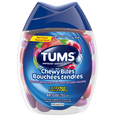 Discover a new way to get the same heartburn relief of TUMS in a new delicious format! TUMS Chewy Bites have a delicious crunchy outer shell and soft chewy center. TUMS Chewy Bites go to work in seconds to neutralize stomach acid on contact. These tasty berry-flavored (strawberry, raspberry, and mixed berry) antacid chews relieve heartburn, indigestion and sour stomach caused by excess stomach acid. TUMS is Canada's #1 selling antacid tablet.