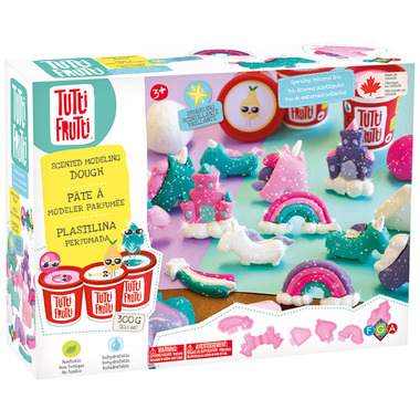 Bring a magical world to life with the Tutti Frutti Sparkling Unicorns Trio Kit. Create enchanting unicorns, castles, rainbows, and sparkles - all with glittering molds that add extra shine to your creations. Tutti Frutti modeling dough is soft, non-toxic, water-based, and rehydratable. It features delightful scents of real fruits and sweets in vibrant, sparkling colours. Mix and blend doughs to create endless new shades and scents for your magical adventures.