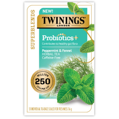 Twinings Probiotics + Peppermint and Fennel Herbal Tea contributes to healthy gut flora.250 million CFUs per cup