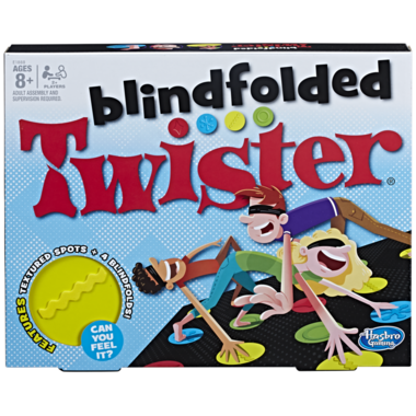 The game that ties you up in knots now features blindfolds and textured shapes for a touch of mystery and loads of fun! In the Blindfolded Twister game, players still move to spots on the mat, but now they do it wearing blindfolds and play completely by touch and memory. The player chosen as the Spinner calls out the moves on the game spinner, and then the players wearing blindfolds feel around the textured shapes with their hands and feet to move around the mat.