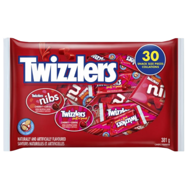 Each bag contains an assortment of 30 snack size pieces of: TWIZZLERS strawberry twists licorice, TWIZZLERS NIBS cherry licorice and TWIZZLERS PULL-N-PEEL cherry candy.