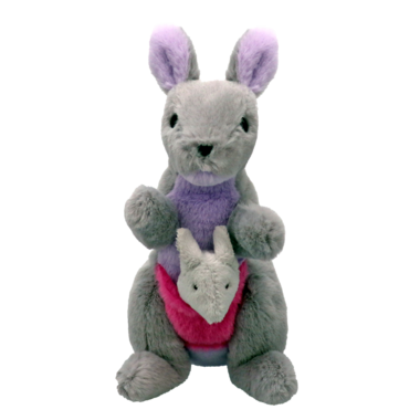 This adorable kangaroo duo is double the fun, with a soft gray coat, lavender accents, and a snug little joey peeking out from its bright pink pouch. Whether hopping into playtime adventures or snuggling up for bedtime, this pair is the perfect cuddle companion. A sweet reminder of the love between parent and child, they’re ready to jump right into your heart!