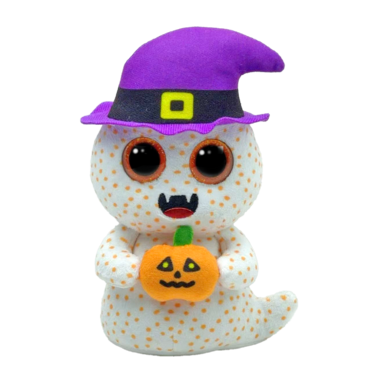 This adorable Halloween plush features a wide-eyed ghost dressed in a purple witch hat with a gold buckle. It holds a smiling jack-o’-lantern, making it the perfect spooky-cute decoration or gift for the season.