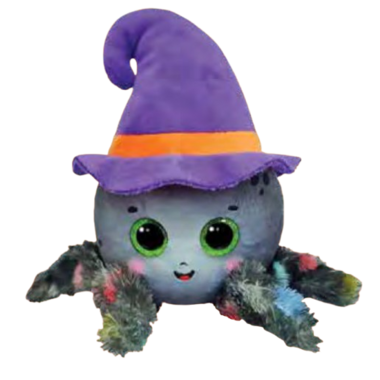 This adorable plush spider wears a whimsical purple witch hat with an orange band, adding a touch of Halloween charm. With its sparkling green eyes and fuzzy multicolored legs, it’s a spooky-cute companion perfect for festive decorating or cuddling.
