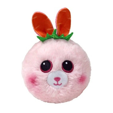 A pink bunny bouncer with carrot style ears. These pint-sized 4-inch plush ball toys combine the classic adorableness of Beanie Babies, the captivating big eyes of Beanie Boos, the compact fun of Puffies, and the bonus of bounce!