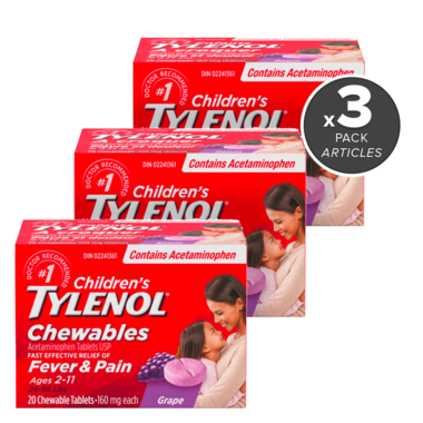 Tylenol Children’s Chewable Tablets dissolve in your child’s mouth to deliver the medicine that will help them get back to normal. Available in two great tasting flavours – Grape and Bubble Gum – to ensure your child will take the correct dose to help them to feel better.