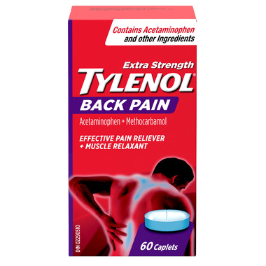 Use TYLENOL? Extra Strength Back Pain 60 Count Caplets for effective pain relief plus a muscle relaxant For effective relief of back pain and muscle spasms Each caplet contains 500 mg acetaminophen which acts as a pain reliever and methocarbamol 400 mg which acts as a muscle relaxant. The #1 doctor-recommended brand of pain reliever- experience relief from minor to moderate aches and pains and painful muscle spasms with TYLENOL? Extra Strength Back Pain