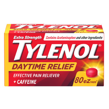 Don't let those daytime headaches slow you down. Extra Strength Tylenol Daytime Relief Tablets combine acetaminophen (pain reliever) and caffeine (pain relief aid) to temporarily relieve headaches and help you get back to your day. It also temporarily relieves pain due to migraines, muscle sprains and strains, and reduces fever. Each tablet contains 500 milligrams of acetaminophen and 65 milligrams of caffeine and comes in an easy-to-swallow format.