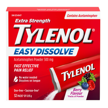 Relieve pain and fever whenever it hits with NEW Extra Strength Tylenol Easy Dissolve. From the #1 doctor recommended brand of pain relief, this extra strength oral pain reliever medicine for adults provides temporary relief from minor aches and pains due to headache, backache, arthritis, muscle aches, menstrual and premenstrual cramps and toothache. Each pain reliever powder sachet contains 500 milligrams of acetaminophen, an effective pain relief medicine and fever reducer No water, no problem. This portable pain relief powder dissolves easily on the tongue--no water needed. With a convenient on-the-go form to have on hand whenever pain hits, the pain medicine features a great tasting berry flavor that's dye-free and sucrose-free. Can be used by adults and children 12 years of age and older.