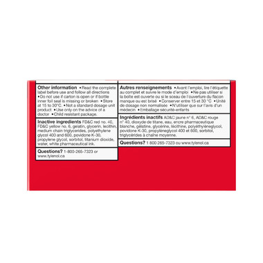 Active ingredient (in each capsule) Acetaminophen 500 mg Purpose Pain reliever, Fever reducer Inactive ingredients FD&C red no. 40, FD&C yellow no. 6, gelatin, glycerin, lecithin, medium chain triglycerides, polyethylene glycol 400 and 600, povidone K-30, propylene glycol, sorbitol, titanium dioxide, water, white pharmaceutical ink.