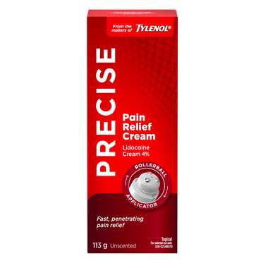 Precise Pain Relief Cream from the makers of Tylenol provides fast, penetrating relief to target pain and muscle soreness precisely where you feel it - back and shoulders, legs and hips, knees, elbows and ankles, and other small joints. Formulated with lidocaine, an ingredient that targets pain receptor nerves to block pain signals. The fast-absorbing, non-sticky cream is fragrance- and dye-free and won't leave any residue behind on skin or clothes. For easy, mess-free application, the topical analgesic includes a massaging rollerball applicator. To use, adults and children 12 and older should apply the pain relief cream to affected areas no more than three to four times daily.