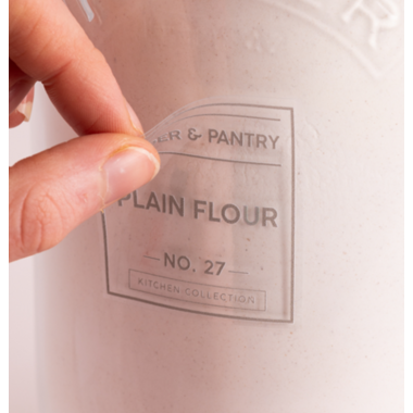 These reusable and transparent French labels attach by clinging to smooth surfaces. Includes 4 sheets of labels for pantry essentials, baking, spices and cleaning. Suitable for glass, shiny plastic and metals, and glossed ceramic and paint finishes. Not suitable for matte and textured surfaces.