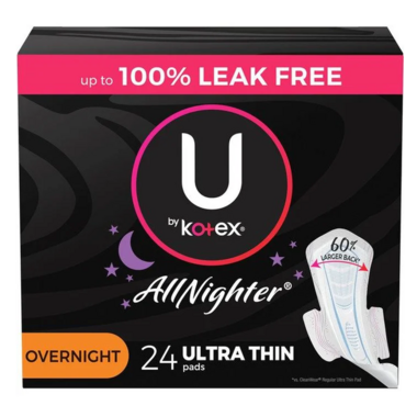 U by Kotex Allnighter Ultra Thin Overnight Pads with Wings provide up to 100% leak free protection and have a 60% larger back for all night protection in any sleep position. Experience worry-free sleep with the unique ComfortFlex design that fits and flexes with your body for outstanding skin comfort. Allnighter menstrual pads feature uniquely shaped Tru-Fit wings designed for a secure fit so you can rest easy. Ultra thin and absorbent, these overnight pads for women are individually wrapped in vibrant colors and patterns inspired by the latest fashion trends.For period protection during the day, try U by Kotex CleanWear Pads with Wings, available in two absorbencies Regular and Heavy.