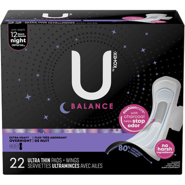 Give yourself a period pad that delivers the most coverage of Ultra Thin pads* with the U by Kotex Balance Ultra Thin Extra Heavy Overnight Pads with Wings. Each pad has a 60% larger front and an 80% larger back** for 360 protection no matter how you sleep. Our menstrual pads also offer up to no back leaks for up to 12 hours of Night Defense, so you can focus on getting a good night's rest. Plus, U by Kotex's unscented pads are dermatologist-tested to be gentle on skin, infused with 100% plant based charcoal and contain no harsh ingredients (made without pesticides, fragrances, lotions, natural rubber latex and elemental chlorine). These sanitary pads feature U by KotexВs raised CushionCore that not only absorbs instantly for up to 100% leak-free protection, but also helps stop odor. The pads design fits and flexes with your body to deliver outstanding skin comfort, while the wings secure the pad in place throughout the night. U by Kotex's feminine pads are individually wrapped, so you can take them with you wherever you go. For period protection during the day, try U by Kotex Balance Ultra Thin Pads.
