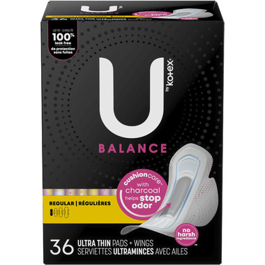 Give yourself a period pad designed for all-night protection with the U by Kotex Balance Ultra Thin Overnight Pads with Wings. Each overnight pad has a 60% larger front and an 80% larger back* for extra protection in any position. These sanitary pads feature U by Kotex's CushionCore with Charcoal that not only absorbs instantly for up to 100% leak-free protection, but is also designed to help neutralize odor and offer comfortable protection. Plus, U by Kotex's unscented pads are dermatologist-tested, contain no harsh ingredients and are made without pesticides, fragrances, lotions, natural rubber latex and elemental chlorine. Each menstrual pad offers up to 12 hours of overnight protection, so you can focus on getting a good night's rest, not on your period. The design fits and flexes with your body to deliver outstanding skin comfort, while the wings secure the pad in place throughout the night. U by Kotex's feminine pads are individually wrapped in vibrant colors and patterns, so you can take them with you wherever you go. For period protection during the day, try U by Kotex Balance Ultra Thin Pads.