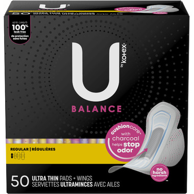 Get yourself a pad that's designed to keep up with you and your day with the U by Kotex Balance Ultra Thin Feminine Pads with Wings. Each period pad comes with U by Kotex's CushionCore that absorbs instantly for up to 100% leak-free protection for up to 10 hours. The CushionCore is also infused with 100% plant-based charcoal to help stop odor, so you can focus on your day, not on your period. Not only that, but these sanitary pads are dermatologist-tested, contain no harsh ingredients and are made without pesticides, fragrances, lotions, natural rubber latex and elemental chlorine. The wings secure the pad in place throughout your day, while the menstrual pad itself is uniquely shaped to fit and flex with your body to deliver outstanding skin comfort. Each U by Kotex pad is individually wrapped in vibrant colors and patterns, so you can take it with you wherever you go. For overnight protection in any sleep position, try U by Kotex Balance Ultra Thin Overnight Pads.