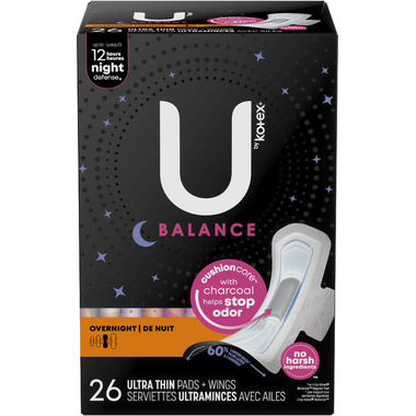 Give yourself a period pad designed for all-night protection with the U by Kotex Balance Ultra Thin Overnight Pads with Wings. Each overnight pad has a 60% larger back* for 360 protection in any position. Our menstrual pads also provide up to no back leaks for up to 12 hours of Night Defense, so you can focus on getting a good night's rest no matter how you sleep. Plus, U by Kotex's unscented pads are dermatologist-tested to be gentle on skin, infused with 100% plant based charcoal and contain no harsh ingredients (made without pesticides, fragrances, lotions, natural rubber latex and elemental chlorine). These sanitary pads feature U by KotexВs raised CushionCore that not only absorbs instantly for up to 100% leak-free protection, but also helps stop odor. The pads design fits and flexes with your body to deliver outstanding skin comfort, while the wings secure the pad in place throughout the night. U by Kotex's feminine pads are individually wrapped, so you can take them with you wherever you go. For period protection during the day, try U by Kotex Balance Ultra Thin Pads.