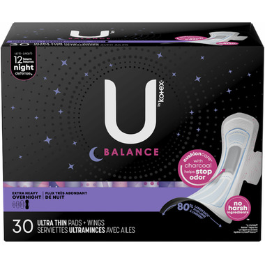 Give yourself a period pad that delivers the most coverage of Ultra Thin pads* with the U by Kotex Balance Ultra Thin Extra Heavy Overnight Pads with Wings. Each pad has a 60% larger front and an 80% larger back** for 360 protection no matter how you sleep. Our menstrual pads also offer up to no back leaks for up to 12 hours of Night Defense, so you can focus on getting a good night's rest. Plus, U by Kotex's unscented pads are dermatologist-tested to be gentle on skin, infused with 100% plant based charcoal and contain no harsh ingredients (made without pesticides, fragrances, lotions, natural rubber latex and elemental chlorine). These sanitary pads feature U by KotexВs raised CushionCore that not only absorbs instantly for up to 100% leak-free protection, but also helps stop odor. The pads design fits and flexes with your body to deliver outstanding skin comfort, while the wings secure the pad in place throughout the night. U by Kotex's feminine pads are individually wrapped, so you can take them with you wherever you go. For period protection during the day, try U by Kotex Balance Ultra Thin Pads.