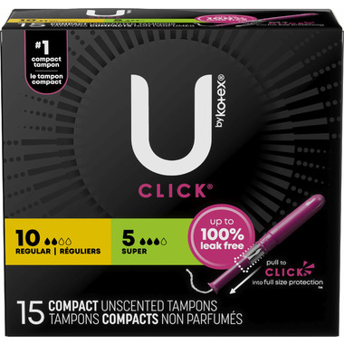Get up to 100% leak-free protection and stay confident throughout your day with U by Kotex Click Compact Tampons! Made without fragrance, Click tampons for women are designed for your comfort and have a smooth tip for easy and comfortable insertion. Each tampon features ComfortFlex grooves that move with y ou for outstanding comfort. Try U by Kotex Click Tampons and see why the #1 compact tampon* is chosen by women every 1.9 seconds. Pocket-sized and small enough to carry in your purse or pocket, these tampons go from compact to a full-size tampon in one easy step giving you comfortably compact, powerful protection. Pull the lower half of the tampon and when it locks in place, its ready to go! U by Kotex Click Compact Tampons are available in regular, super and super plus absorbencies. For backup period protection, try U by Kotex Barely There Pantiliners.