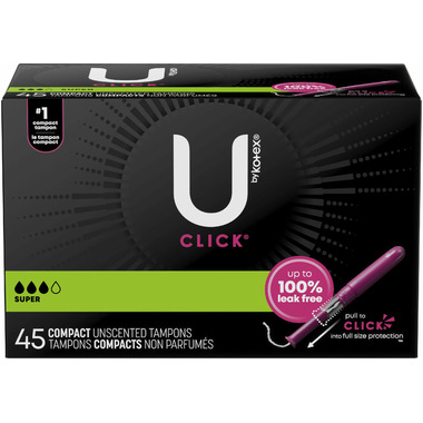 Get up to 100% leak-free protection and stay confident throughout your day with U by Kotex Click Compact Tampons! Made without fragrance, Click tampons for women are designed for your comfort and have a smooth tip for easy and comfortable insertion. Each tampon features ComfortFlex grooves that move with you for outstanding comfort. Try U by Kotex Click Tampons and see why the #1 compact tampon* is chosen by women every 1.9 seconds. Pocket-sized and small enough to carry in your purse or pocket, these tampons go from compact to a full-size tampon in one easy step giving you comfortably compact, powerful protection. Pull the lower half of the tampon and when it locks in place, its ready to go! U by Kotex Click Compact Tampons are available in regular, super and super plus absorbencies. For backup period protection, try U by Kotex Barely There Pantiliners.