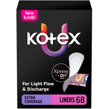 Xpress Dri Core: Kotex pantiliners are made with an Xpress Dri Core to absorb light flow instantly.