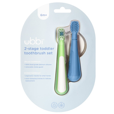 Support your babys oral care journey with Ubbi's 2-stage toothbrush set designed to grow from baby to toddler. This complete set includes a silicone training toothbrush with 360 massaging bristles and a removable safety choke guard to start your baby on their oral care journey, plus a soft-bristled beginner toothbrush perfect for teaching toddlers how to brush their teeth. The ultra-soft bristles are safe for tiny teeth and sensitive gums. The kids toothbrush features color-changing bristles to indicate when its time to replace. Ubbi's complete 2 toothbrush set helps your little one transition into independent teeth brushing.