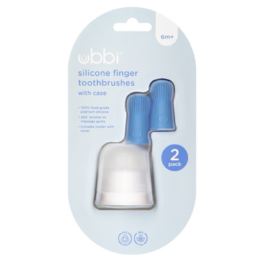 Help soothe sore gums and start healthy brushing habits early with Ubbi's Finger Toothbrush Set. This silicone finger toothbrush and case set is made from 100% platinum-grade silicone, each toothbrush features ultra-soft 360 bristles that gently massage babys gums and clean tiny teeth from every angle. Perfect for teething relief, this training toothbrush is safe for daily use and designed for small mouths. The included hygienic holder with cover keeps the brush clean and protected at home or on the go. PVC-free and BPA-free, its the ideal first toothbrush for your teething baby.