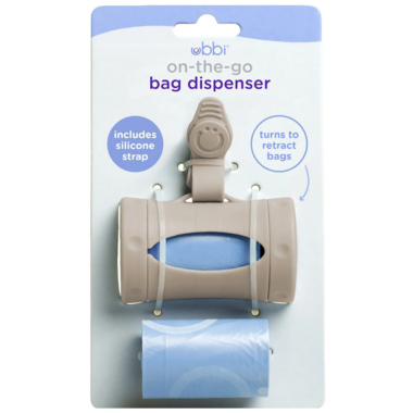 The Ubbi On-The-Go Bag Dispenser Set offers a stylish and convenient way to carry and dispense waste bags while you're out and about. Designed with a durable, compact case and an easy-to-use dispensing slot, it clips effortlessly onto strollers, diaper bags, or backpacks. Complete with a roll of bags, its a practical must-have for quick, hygienic cleanups on the go.