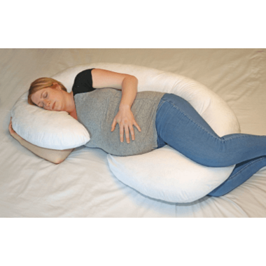 This "C" shaped side sleeping luxury body pillow provides exceptional comfort and support for your head, neck and shoulder and curves down behind your back for much needed back support, then curls in between the legs/knees for pelvic/hip support to help reduce lower back pain and then tucks under the belly for baby bump support. This assures you better sleep, the thing you need most of all during your pregnancy and post natal period.
