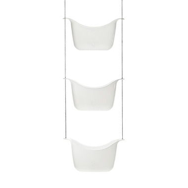 Set of 3 polypropylene baskets suspended with stainless steel ball chain and two hooks. Can be hung on shower head or shower curtain rod.